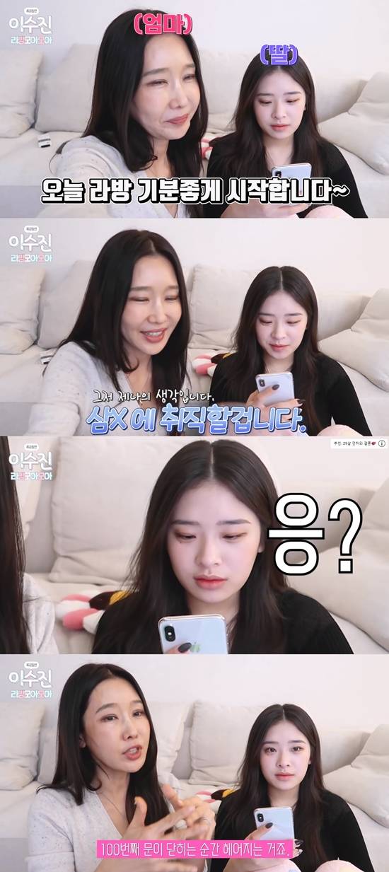 또 다른 구독자는 "이수진 옆에 제나가 있어서 아무나 만나지 않아 다행이다"라고 말했다. 그러나 제나는 "아무나 만난다. 다 들어온다"라고 담담히 답했다.
