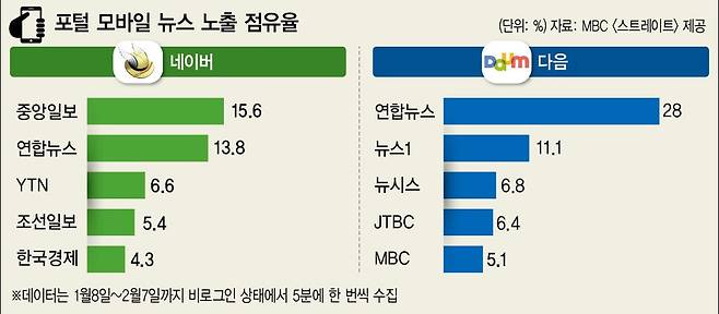 7일 <문화방송>(MBC) 탐사기획 프로그램 <스트레이트>는 데이터 전문 분석업체에 의뢰해 1월8일부터 2월7일까지 한 달 동안 네이버·다음 모바일 앱의 뉴스 배열 데이터를 수집한 결과를 보도했다. 데이터는 모든 이용자에게 동일한 기사를 보여주는 비로그인 상태에서 5분에 한 번씩 앱에 접속해 뉴스 영역에서 가장 잘 보이는 최상위 기사 7개를 모았다. 언론사별 성향은 복수의 언론학자에게 자문받은 대로 분류했다.