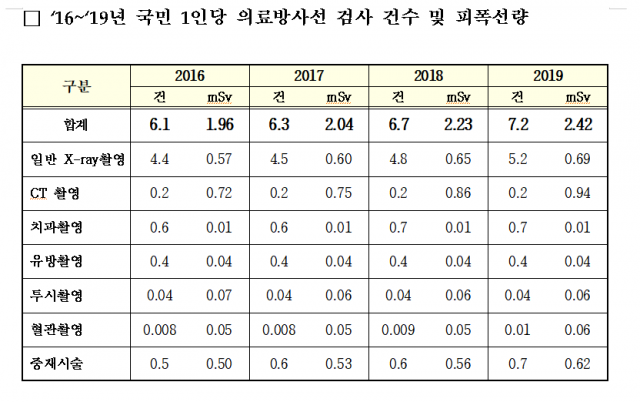 1인당 방사선 피폭선량 2019년 1.96mSv..미국, EU등보다 높아