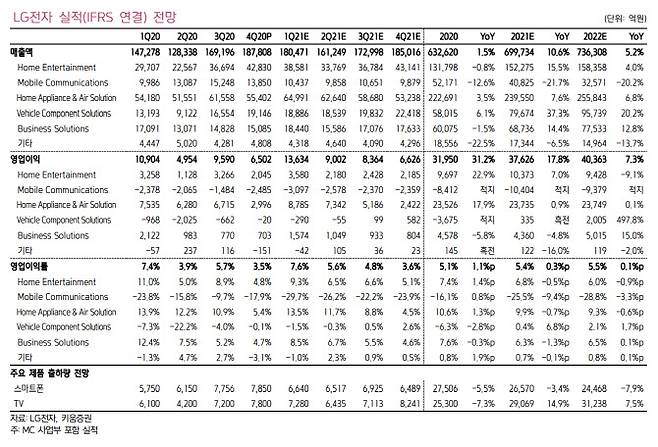 김 연구원은 "가전과 TV 중심의 '홈코노미' 수요 강세가 이어지고 자동차 부품 사업도 체질 개선 성과를 보여줄 것"이라며 "LG전자의 매출과 영업이익에 포함되는 연결 재무제표 작성 대상인 LG이노텍(011070)도 광학 솔루션 위주로 기대 이상의 실적을 기록할 것으로 예상된다"고 했다.