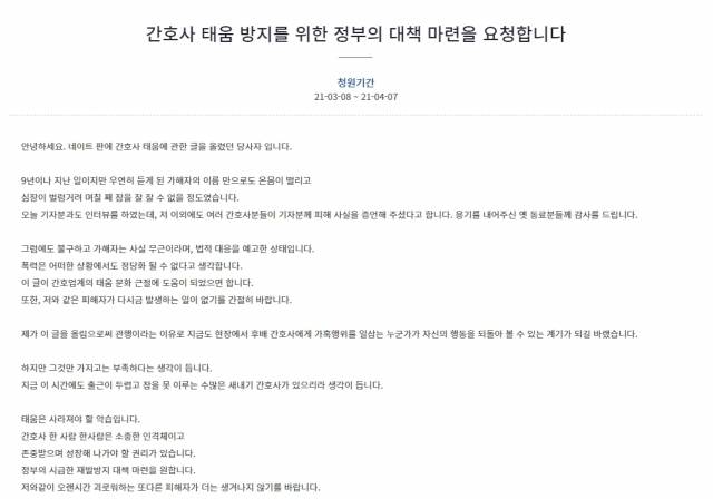 그는 태움 재발 방지와 관련한 청원도 공유하면서 “이 글로 어떤 금전적 보상도 원치 않으며, 진정성 있는 사과를 원한다. 나아가 재발 방지를 위한 근본적인 대책을 원할 뿐이다. 이 글이 간호업계의 태움 문화 근절에 도움이 되었으면 한다”고 했다.