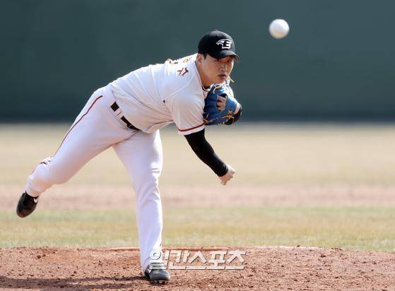2021 KBO 프로야구 한화이글스와 KIA타이거즈의 연습경기가 10일 오후 대전 한화이글스파크에서 진행됐다. 구원등판한 김종수가 공을 던지고 있다.