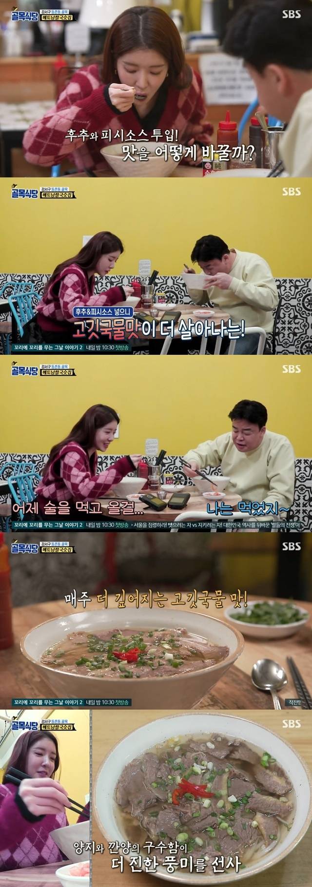 백종원은 “나는 먹었지”라고 너스레를 떨었고, 정인선은 거듭 감탄사를 내며 “국물이 진짜 소리 나는 그 맛이다 딱”이라고 호평해 맛을 궁금하게 했다. 또 정인선은 양지만 들어간 쌀국수보다 깐양도 들어간 쌀국수가 더 맛있다고 평했다. (사진=SBS ‘백종원의 골목식당’ 캡처)