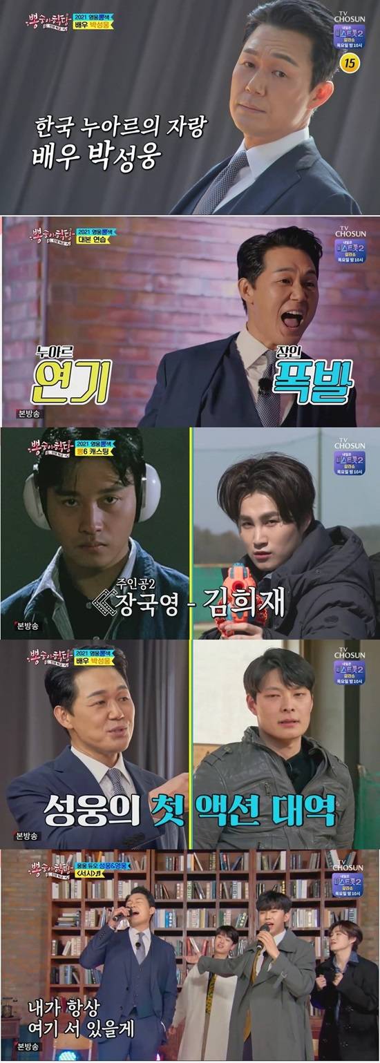 지난 10일 방송된 TV조선 '뽕숭아학당: 인생학교'에서는 배우 박성웅이 특별 출연해 트롯맨들과 특별한 액션 연기 수업을 진행하며 누아르 영화의 정석 '영웅본색'을 패러디해 웃음을 안겼다.
