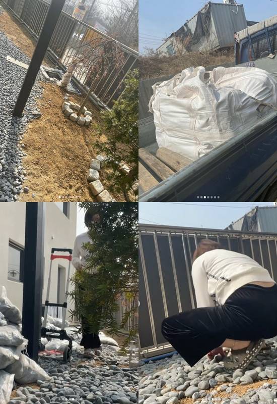 이상아는 11일 자신의 인스타그램에 "헥헥헥... 혼자서 1톤 자갈 받고 혼자서 낑낑. 보다 못한 분양사무소 팀들 합류. 글고 뒤늦게 할무이 합류.. 했다.. 마당 정리 마감 끝.... 이제 뭘 해놓을까... 한층 넓어 보이는 우리 집 마당"이라는 글과 함께 여러 장의 사진을 게재했다.