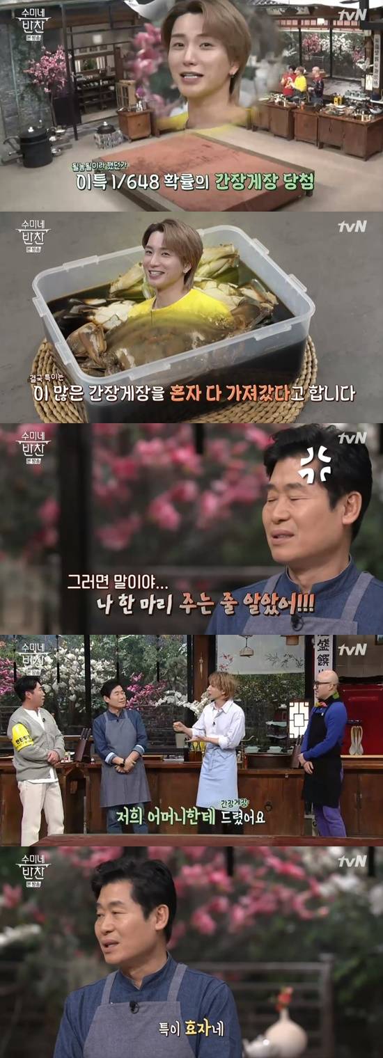 11일 방송된 tvN '수미네 반찬'에서는 지난 방송에서 추억의 뽑기 게임을 통해 간장 게장을 가져간 이특이 비하인드 스토리를 밝혔다.