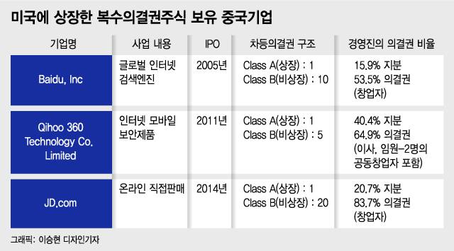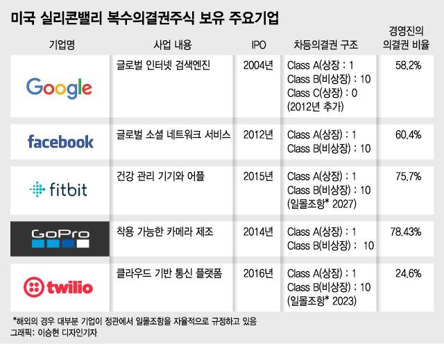 복수의결권의 성공 사례로 가장 많이 언급되는 건 구글이다. 2004년 구글 지주사 알파벳이 상장할 때 일반용 클래스A와 경영자에 주당 10개 의결권을 부여하는 클래스B를 발행했다.