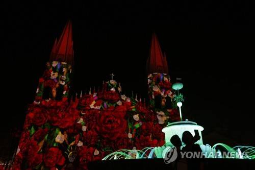 epaselect epa09071041 A couple takes a selfie during the projection of a video mapping on the facade of the Metropolitan Cathedral at the historic center of Guadalajara, Jalisco state, Mexico, 12 March 2021. As part of the program 'Renewing the Heart of the City, the government of Guadalajara carries out the permanent projection of video mapping on the facades of the Metropolitan Cathedral and the Temple of the Shrine of Our Lady of Guadalupe to strengthen the tourist and economic reactivation of the Historic Center that was affected by social isolation in the face of the COVID-19 health emergency. EPA/Francisco Guasco