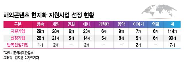 반면 문화콘텐츠 수출 지원사업은 업종별로 제한이 없어 매출 증가 분야 역시 지원을 받았다는 지적이다. 지난해 해외수출 콘텐츠 현지화 사업엔 기업 114곳이 지원해 90곳이 선정됐는데, 이중 21개 업체가 게임, 5개 업체가 만화 콘텐츠 기업인 것으로 나타났다. 게임업종에선 2개 업체가 반복선정됐다.