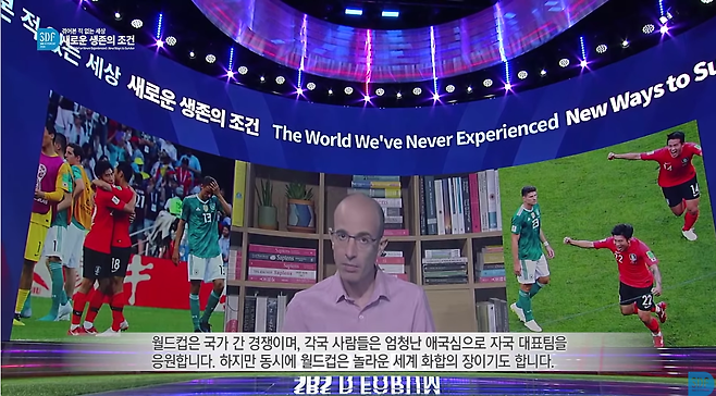 "인류가 지금 얼마나 잘 단결돼 있는지를 보려면 월드컵 축구를 생각하시면 됩니다. 2018년 제가 베를린 브란덴부르크문 근처에서 독일 사람 수만 명과 함께 한국이 독일을 이기는 것을 봤습니다. 월드컵은 국가 간 경쟁이며, 각국 사람들은 엄청난 애국심으로 자국 대표팀을 응원합니다. 하지만 동시에 월드컵은 놀라운 세계 화합의 장이기도 합니다. 대한민국과 독일이 축구 규정에 대한 합의 없이 경기를 할 수 없습니다.