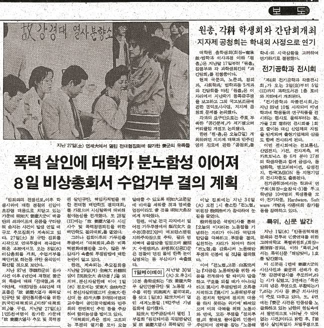 | ▲ 김성학씨 실종사건은 1991년 4월과 5월 '분신정국'이 만들어지면서 묻혀 버렸다. 사진은 1993년 5월 3일자 <고대신문>. |