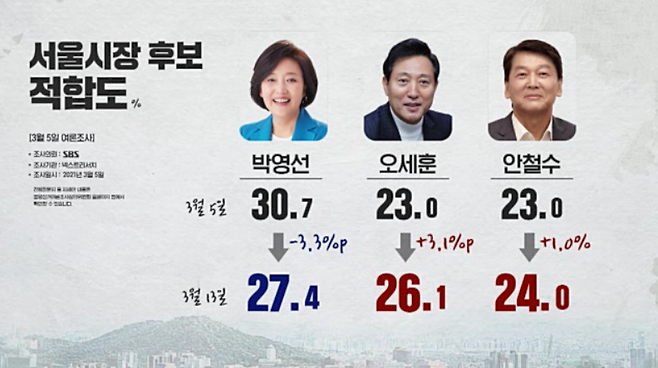 지난 5일 SBS 여론조사와 비교하니, 박 후보는 3.3%p 떨어졌고, 오 후보와 안 후보는 각각 3.1%p, 1%p씩 올랐습니다.