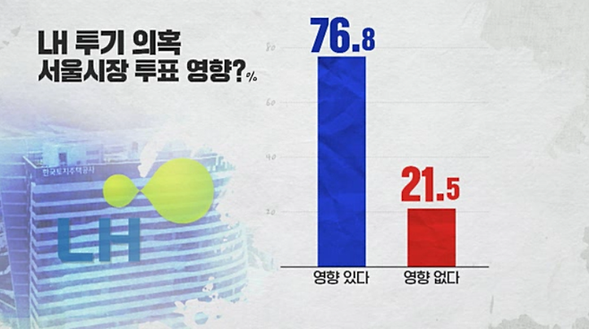 LH 직원 투기 의혹이 선거에 미치는 영향을 물었더니, 영향 있다 76.8%, 영향 없다 21.5%로 조사됐습니다.