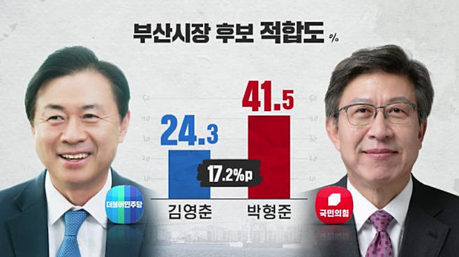 민주당 김영춘 24.3%, 국민의힘 박형준 후보 41.5%로 17.2%p 차이입니다.