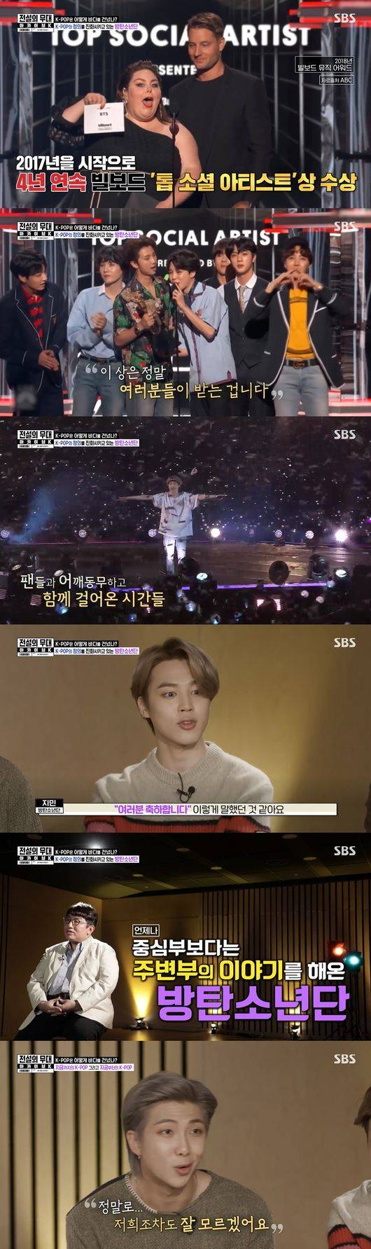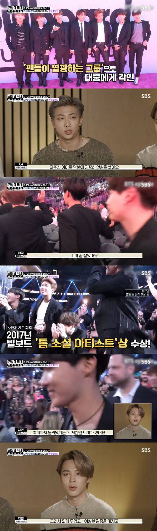 15일에 방송된 SBS '전설의 무대 아카이브K'에서는 방탄소년단이 등장해 케이팝에 대한 다양한 이야기와 경험을 이야기했다.