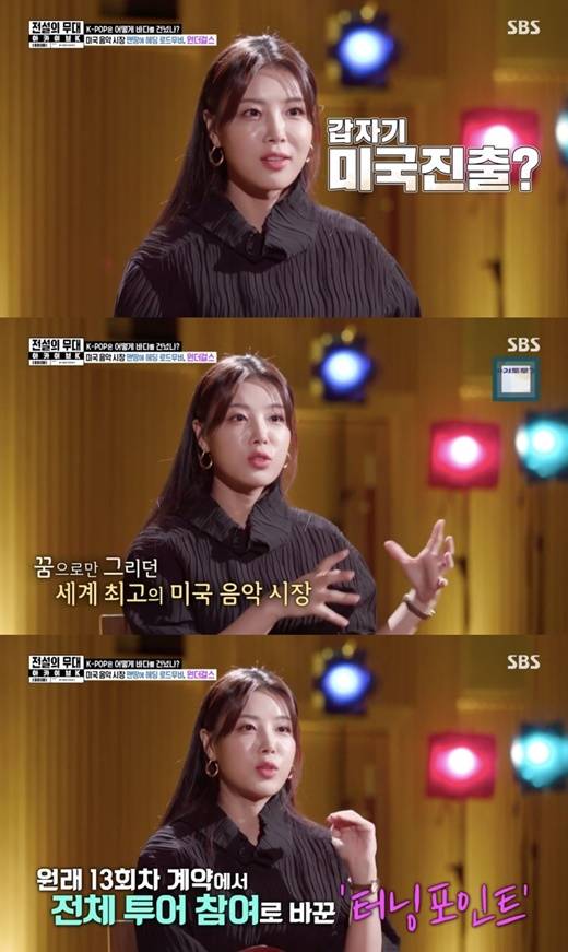 14일 방송된 SBS '전설의 무대-아카이브K’에 출연한 유빈은 박진영과 함께 원더걸스 미국 진출 비하인드 스토리를 공개했다.