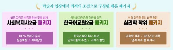 배론원격평생교육원에서는 사회복지사2급 자격증 취득과 경력개발을 위해 민간자격증 과정도 함께 운영 중에 있으며, 건강가정사 자격취득 기회까지 한번에 해소할 수 있도록 함께 운영하고 있다. 또한, 자격증, 학위 취득을 위해 수강해야 할 교과목을 더 경제적인 가격으로 쉽고 빠르게 취득할 수 있도록 재평가 100% 통과가 되어 지난 오는 3월 18일 개강반을 모집한다. 교육부 평가인정을 통과한 우수한 강의를 과목당 첫결제 29,000원에 할인 가격으로 수강할 수 있다.