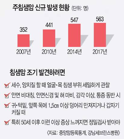 침샘암은 국내에서 매년 인구 10만명 당 1.4~2명꼴로 발생하는데, 서양에선 연간 10만명 당 6명 미만의 암을 희귀암으로 분류한다. 15일 중앙암등록통계에 따르면 주침샘암 기준으로 2007~2009년 300명대, 2010~2013년 400명대, 2014년부터 최근까지는 매년 500명대의 신규 환자가 발생하는 등 증가 추세인 것으로 나타났다. 건강보험심사평가원 진료 통계를 봐도 비슷한 경향임을 알 수 있다(2015년 1284명→2019년 1597명).