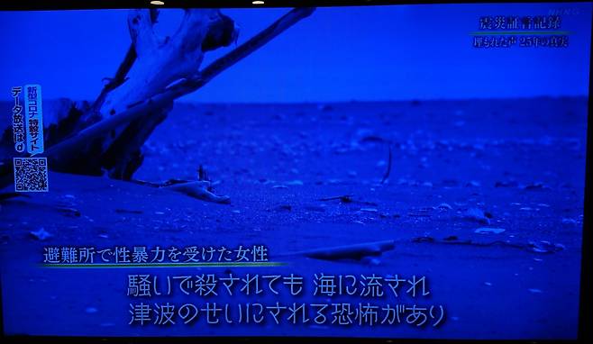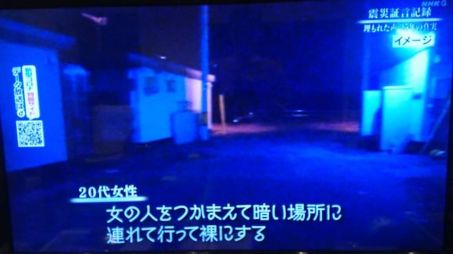 | ▲ 일본 NHK 다큐멘터리 <묻힌 소리 - 25년의 진실 '피난지의 성폭력'> 중 한 장면. "여자를 붙잡아 어두운 곳으로 끌고 들어가 옷을 벗겼다"라는 자막이 쓰여있다. |