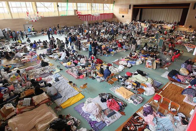 | ▲ 일본 동북지방에 진도 9의 강진이 발생한지 사흘이 지난 2011년 3월 14일 오후 일본 이와테현 리쿠젠타카타 시의 한 학교에 마련된 피난소가 피난민들로 가득 차 있다. 2011.3.14 |