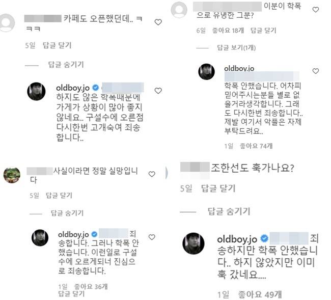 이 뿐만 아니라 조한선은 "학폭 안 했습니다. 어차피 믿어주시는 분들 별로 없을 거라 생각합니다. 그래도 다시 한번 죄송합니다" "죄송하지만 안 했습니다. 하지 않았지만 이미 훅 갔네요" 등 댓글 하나하나에 답변을 남기며 결백을 호소했다. 본인이 가장 억울한 상황에 처해있으면서도 구설수에 올라 죄송하다고 말하는 광경이 안타까움과 씁쓸함을 동시에 불러왔다.