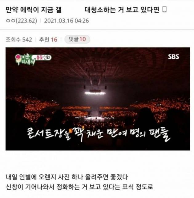 한 팬은 신화갤에 "내일 인별에 오렌지 사진 하나 올려주면 좋겠다. 신창이 정화하는 거 보고 있다는 표식 정도로. 갤이 지속되든 안 된든 일단 정화작업을 꾸준히 해봐야할 듯"이라는 글을 남겼다. 이 글이 올라온 뒤 시간이 채 지나지 않아 에릭은 새 글을 업데이트했다.
