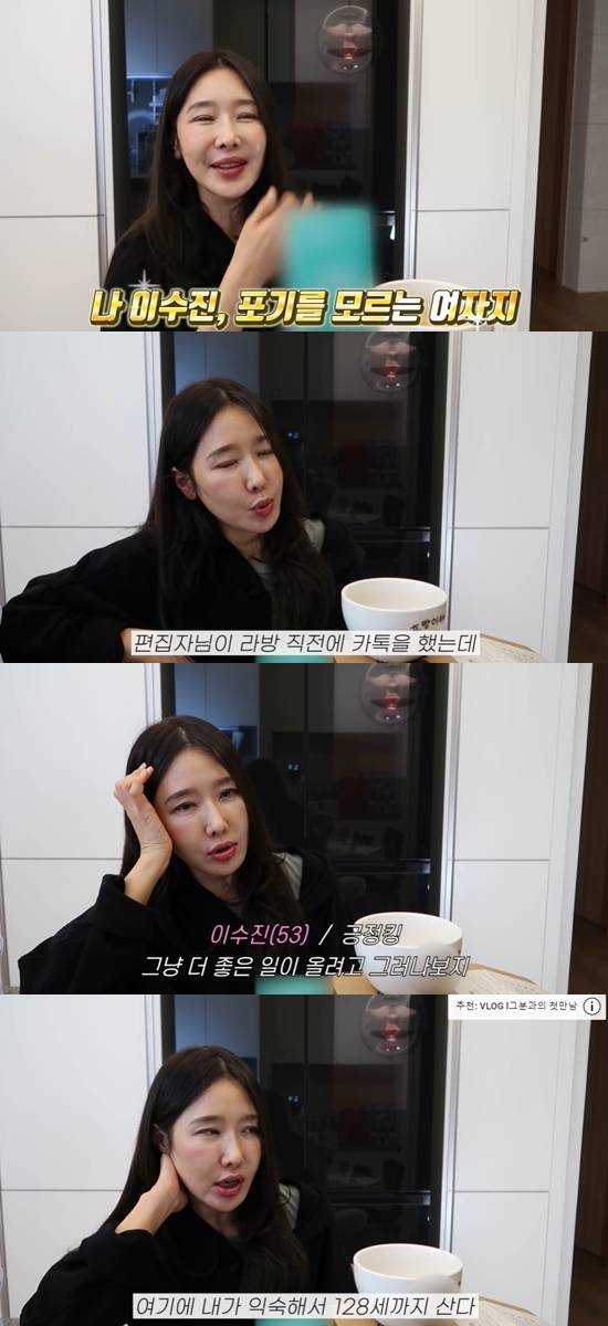 그러면서 "그럴 땐 그냥 받아들인다. 더 좋은 일이 올려나 보다. 다시 하면 된다"고 덧붙였다. 이수진의 긍정적인 마인드에 구독자들은 "늘 배운다"라며 칭찬했고, 이에 이수진은 "다들 저랑 얘기하면 기분이 좋다고 그러더라"라고 흡족해했다.
