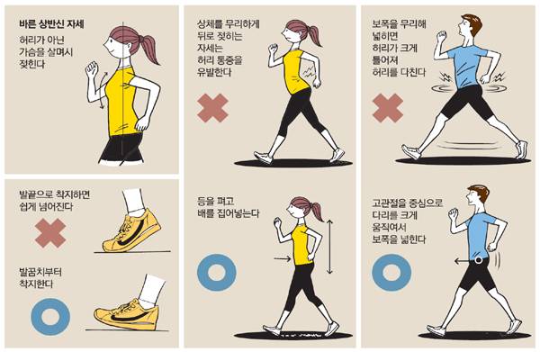 걷기는 자세도 중요하다. 걷기는 제대로 걸으면 약(藥)이지만 잘못 걸으면 어깨, 목, 무릎, 허리에 통증을 유발할 수 있다.