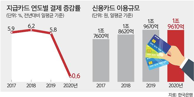 한국은행이 16일 발표한 ‘2020년 중 국내 지급결제동향’에 따르면 지급카드 이용규모는 일평균 2조5210억원으로 2020년 대비 0.6% 증가하는 데 그쳤다. 2017년부터 2019년까지 5∼6%대의 사용액 증가를 기록한 것에 비하면 큰 폭의 둔화다.