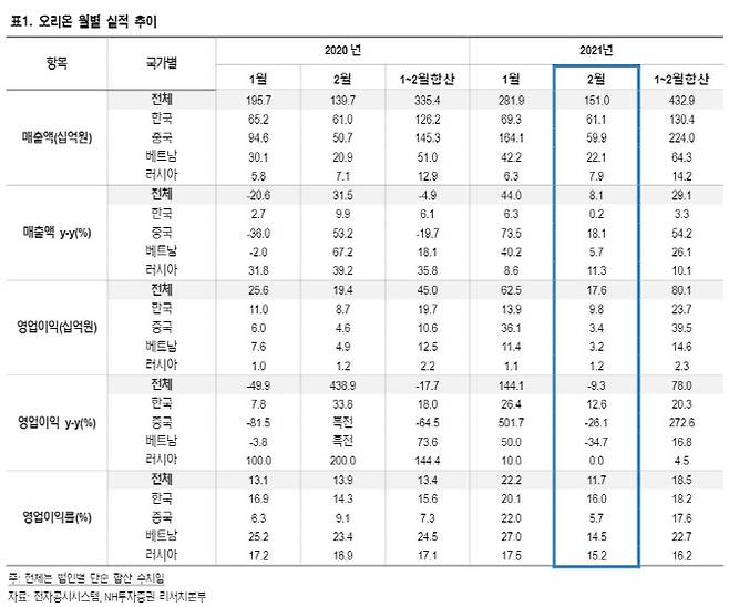 NH투자증권은 17일 오리온(271560)에 대해 올해 1분기 매출액과 영업이익 모두 전년 대비 두자릿수로 증가할 전망으로, 견조한 매출 성장 흐름과 펀더멘털에 주목할 때라고 전했다.