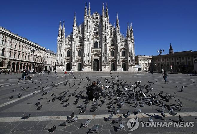 (밀라노 AP=연합뉴스) 16일(현지시간) 신종코로나바이러스감염증(코로나19) 봉쇄 조치가 다시 시행된 탓으로 인적이 끊긴 이탈리아 밀라노의 두오모 성당 주변 광장에서 한 여성이 비둘기 떼의 사진을 찍고 있다.