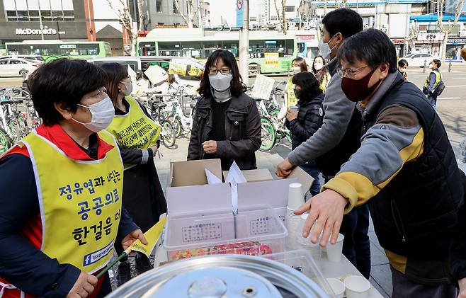 | ▲ 김소연 비정규직노동자의 집 ‘꿀잠’ 운영위원장과 유흥희 비정규직이제그만 집행위원장이 17일 오전 영등포구 영등포역에서 신종 코로나바이러스 감염증(코로나19) 확산 당시 의료공백으로 숨진 고 정유엽 군의 아버지 정성재씨와 시민을 응원하며 떡과 음료를 나눠주고 있다. |