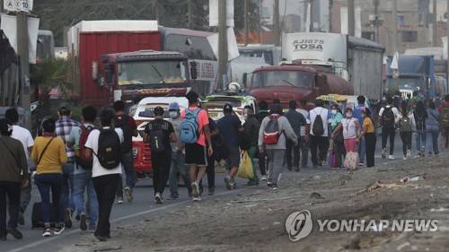 Residents walk along the Central Highway while it's blocked by trucks and buses in Chaclacayo on the outskirts of Lima, Peru, Thursday, March 18, 2021. Cargo truckers and passenger buses are blocking highway access to the capital to demand lower fuel prices, tax breaks, and the lowering of toll prices. (AP Photo/Martin Mejia)