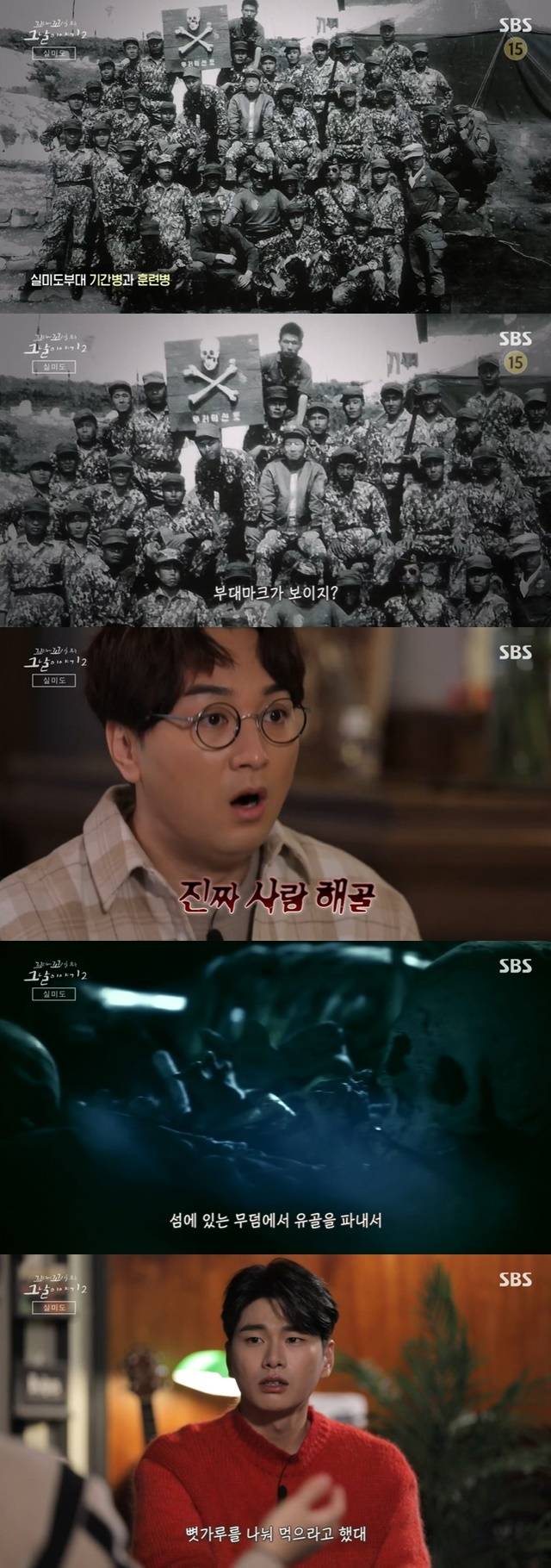 당시 이들은 혈서를 쓰듯이 섬에 있는 무덤에서 유골을 파내서 뼛가루를 나눠먹으며 정신무장을 하고 남은 다리뼈와 두개골로 부대마크를 만들었다. 그 부대 마크를 한 가운데 세워놨는데 밤에는 사람 뼈에서 빛이 났다고 전해져 섬뜩함을 더했다. (사진=SBS ‘꼬꼬무2’ 캡처)