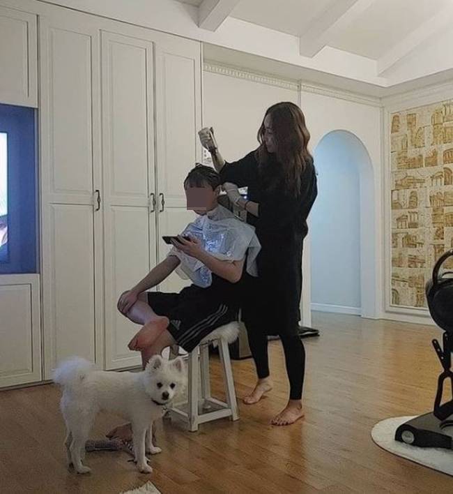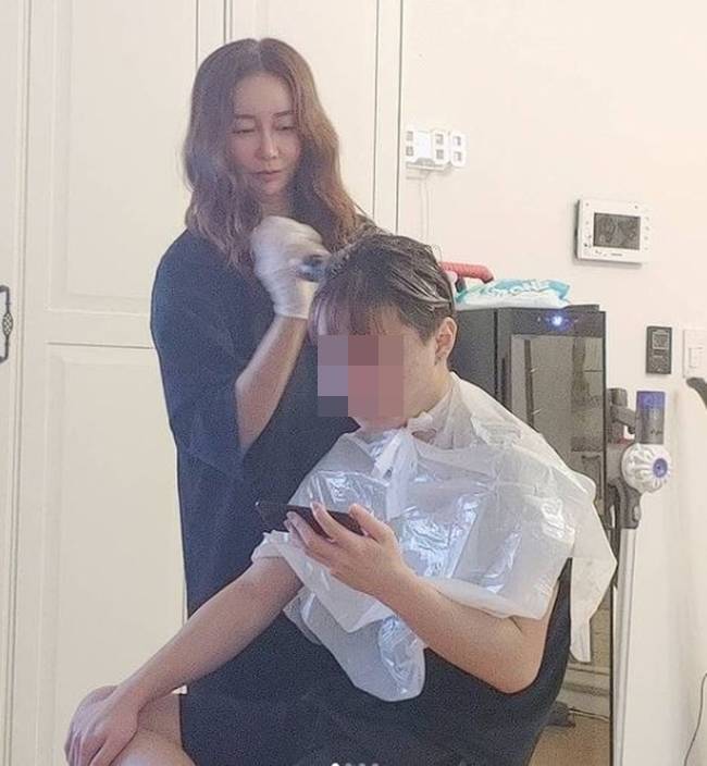 공개된 사진에는 아들의 탈색 머리를 직접 염색하는 김지현의 모습이 담겨 있다.