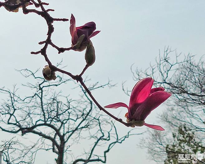 봄 이면 제일 먼저 떠오르는 오래된 개나리가 노란 모습으로 꽃을 피우고 백목련과 적목련도 앞다퉈 봄소식을 전해주고 있습니다.