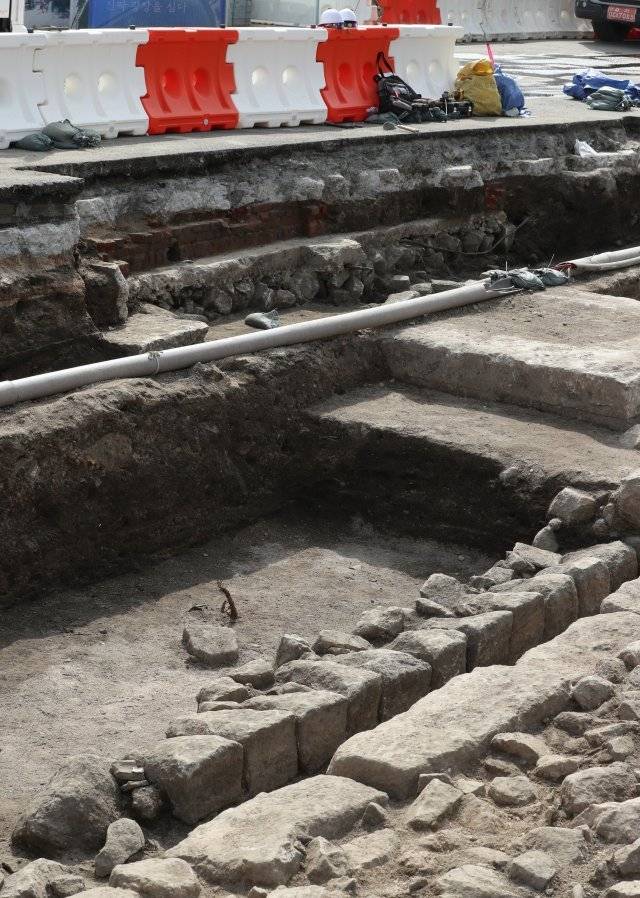 서울 광화문광장 재구조화 공사 중 정부서울청사 앞에서 조선시대 것으로 추정되는 수로, 담장, 기단 등 유적이 나왔습니다.