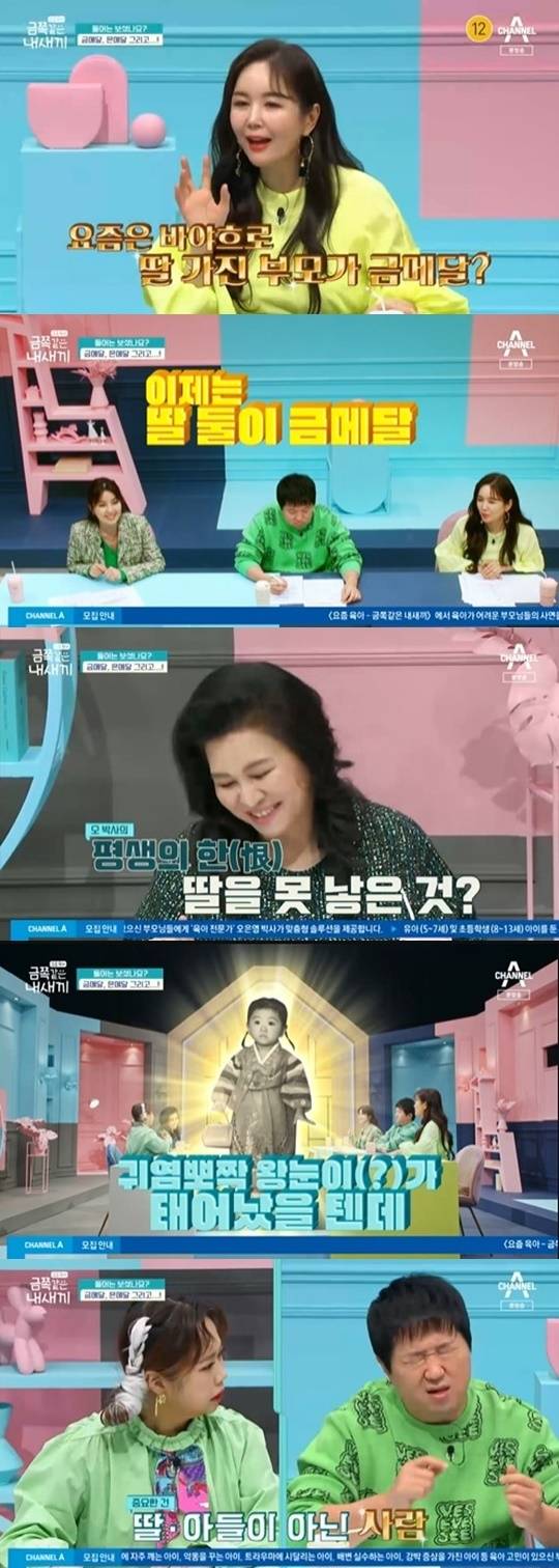 이에 외동아들만 둔 오은영은 “딸을 못 낳은 게 평생의 한”이라며 웃었다. 이에 홍현희는 “저를 딸 삼아주세요”라고 말했고 오은영은 “안 그래도 현희 씨가 새해에 새배하러 왔었다”며 애정을 드러냈다. 신애라가 “딸을 낳았으면 박사님처럼 눈이 큰 아이가 태어났을 텐데”라고 하자 오은영은 “아들, 딸이 중요한 게 아니라 사람으로 키우는 게 중요하다”고 강조했다.(사진=채널A ‘요즘 육아-금쪽 같은 내 새끼’ 캡처)