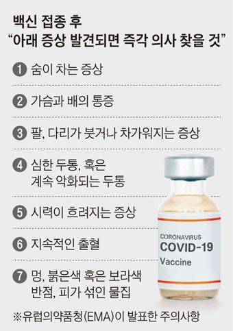 의료계에선 정부가 AZ 접종 후 혈전 증세가 나올 경우에 대해 상세하게 국민에게 안내해야 한다고 지적했다. EMA는 “혈액 응고를 암시하는 증상이 나타나면 즉시 치료를 받아야 한다”고 했다. EMA가 말한 혈전 징후는 백신 접종 후 숨이 차는 증상, 심하거나 악화하는 두통, 시력이 흐려지는 증상, 지속된 출혈, 멍이나 붉은 반점(보라색 포함) 등이다.<그래픽 참조> 천은미 이대목동병원 교수는 “혈전이나 혈액 응고 장애가 발생했을 때 흔히 관찰되는 대표적인 증상”이라며 “어떤 증상이 어느 정도로 심각하면 응급실을 방문하라는 세부적인 가이드라인을 알려야 한다”고 했다.