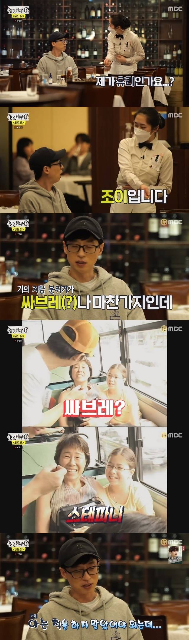 이날 유재석은 친절한 서버를 "유리 씨"라고 불렀다. 그러나 서버는 "제가 유리인가요?"라고 물으며 자신의 이름을 조이라고 다시 밝혔다. 유재석은 어색한 웃음 후 혼자 남았을 때 "분위기가 싸브레나 마찬가지인데. 아는 척을 하지 말았어야 했는데"라며 과거 '무한도전' 때를 떠올리며 후회해 웃음케 했다. (사진=MBC '놀면 뭐하니?' 캡처)
