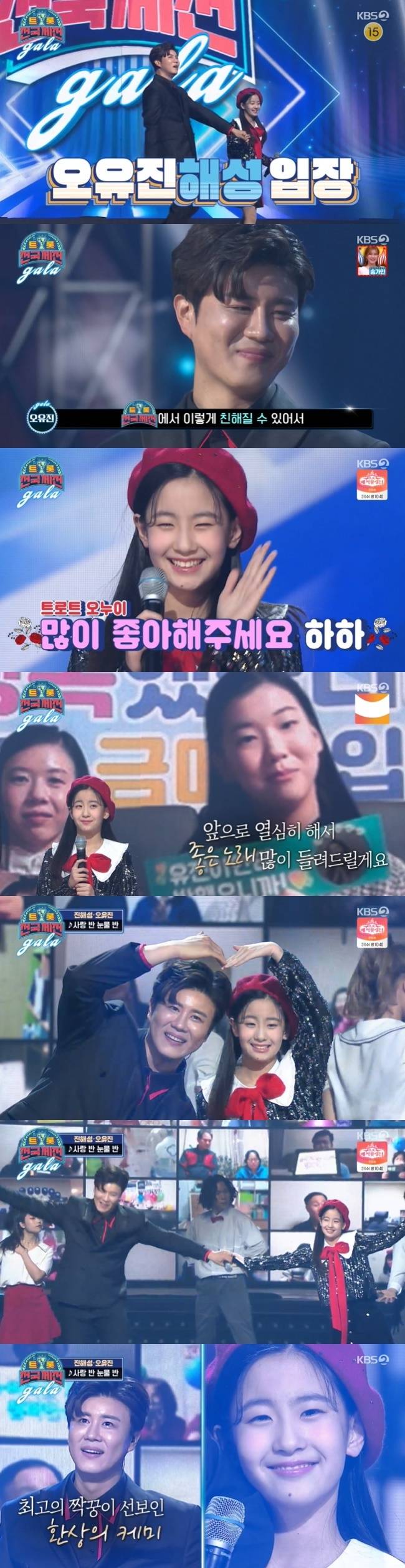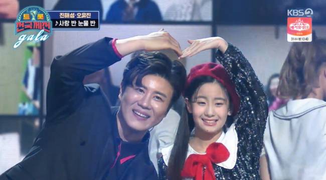 오유진은 진해성의 히트곡 ‘사랑 반 눈물 반’으로 함께 무대를 꾸몄다. 두 사람은 머리 위로 크게 하트를 그리는가 하면, 손을 잡고 짝꿍 댄스까지 선보이며 트로트 오누이의 호흡을 자랑했다. (사진=KBS 2TV '트롯 전국체전 갈라쇼' 방송 캡처)