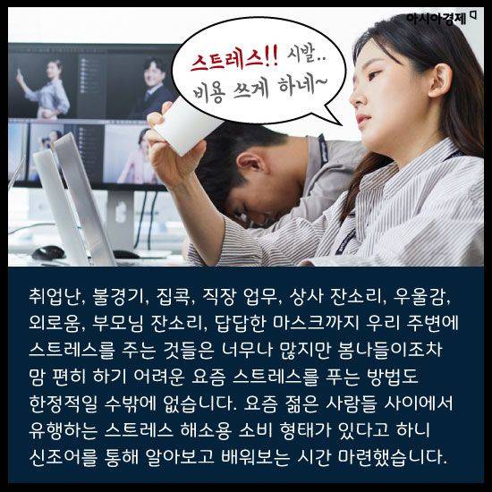 [아시아경제 이진경 기자] 취업난, 불경기, 집콕, 직장 업무, 상사 잔소리, 우울감, 외로움, 부모님 잔소리, 답답한 마스크까지 우리 주변에 스트레스를 주는 것들은 너무나 많지만 봄나들이조차 맘 편히 하기 어려운 요즘 스트레스를 푸는 방법도 한정적일 수밖에 없습니다. 요즘 젊은 사람들 사이에서 유행하는 스트레스 해소용 소비 형태가 있다고 하니 신조어를 통해 알아보고 배워보는 시간 마련했습니다.
