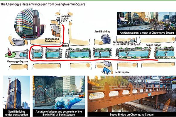 The path described in this piece begins around Jogye Temple and goes past Jonggak Belfry to Gwangtong Bridge and Supyo Bridge on the Cheonggye Stream. Supyo Bridge was built in 1441, in the 23rd year of the reign of King Sejong, with the goal of measuring the stream’s water level. It was also the main bridge by which the monarchs of Joseon crossed the stream.