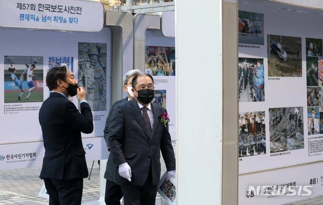 [서울=뉴시스]사진공동취재단 = 안주영 한국사진기자협회 회장이 22일 서울 중구 한국프레스센터 광장 전시장에서 열린 ‘팬데믹을 넘어, 희망을 찾다’ 제57회 한국보도사진전 개막식에서 참석 내빈에게 전시 작품들을 소개하고 있다. 2021.03.22. photo@newsis.com