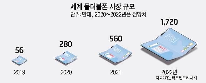 삼성은 폴더블폰을 차기 전략 제품으로 육성하고 있다. 기술 경쟁력에서 앞서 있고 폴더블폰의 성장 가능성이 높아서다. 시장조사업체 카운터포인트리서치에 따르면 지난해 280만대를 기록했던 폴더블폰 시장 규모는 올해 560만대로 늘어나고, 2022년에는 1720만대에 이를 것으로 전망됐다.