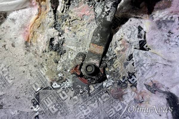 랜드로버코리아 쪽에서 <오마이뉴스>에 공개한 자료를 보면, 차량의 내부 바닥 면과 좌우 옆면 곳곳에 방음재 등이 붙어 있었다. 또 화재가 처음 발생한 곳으로 추정되는 3열 좌석 아래쪽 너트와 배선을 감싸고 있는 피복 등도 벗겨져 있었다.