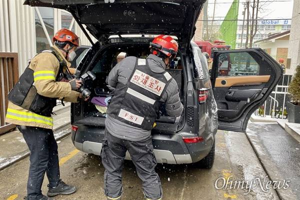 | ▲ 지난 2월 서울 강남구에서 대형 SUV 디스커버리 차량이 운행 중 뒷좌석에서 화재사고가 발생했다. 사진은 화재사고 당시 경찰과 소방당국에서 현장 채증을 하고 있는 모습. |