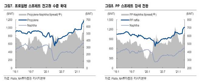 춘절 이후 프로필렌 등 폴리머 수요는 계절적 성수기로 진입해 구매량이 증가할 것으로 보인다. 황 연구원은 “미국 한파로 폴리프로필렌(PP)공급이 감소해 미국내 PP 가격이 크게 올랐으며 아시아와 유럽 시장 내 PP 가격이 상승하고 스프레드가 확대됐다”며 “이는 2분기 실적에 영향을 미쳐 관련 제품 2분기 영업이익은 예상보다 높아질 전망”이라고 했다.