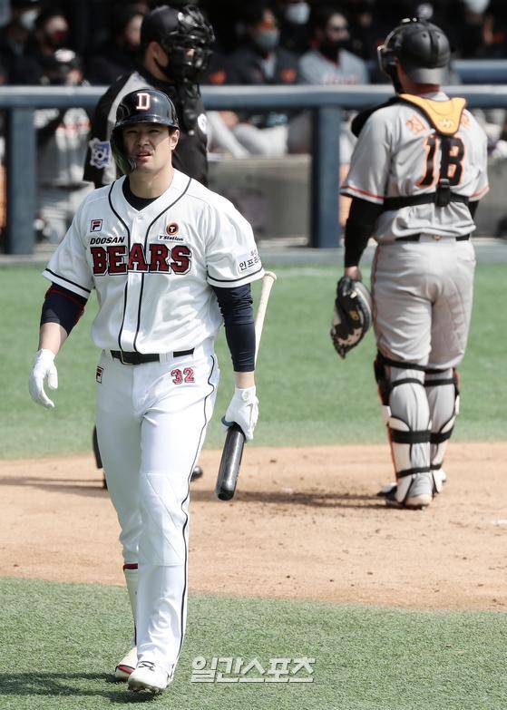 2021프로야구 KBO리그 두산베어스와 한화이글스의 시범경기가 23일 오후 서울 잠실야구장에서 진행됐다. 김재환이 2회말 무사 삼진으로 물러나고 있다.