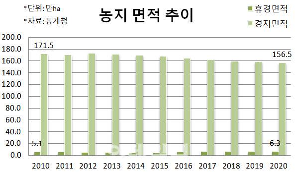 경지 이용 현황을 나타내는 경지이용률은 107.0%로 140%에 달하던 1970년대보다 크게 줄었다. 전국 경지면적 자체도 156만5000여ha로 통계를 시작한 1975년 이후 최저치에 머물렀다. 그사이 경지면적은 약 224만ha에서 30.1%(67만5000ha) 줄었다.